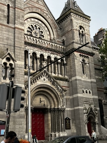 By the time we arrived in Dublin, my spousal unit was very ill. I knew he was sick when his Energizer Bunny battery died. We walked to a seafood restaurant that had “just closed their kitchen for an hour,” so we opted for a steak across the street. As we walked, I realized the buildings next to me were Boston College.