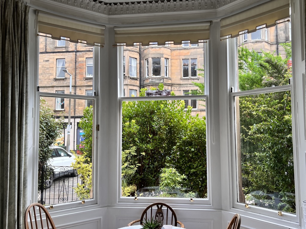 Our Airbnb had a lot of light, even on a somewhat gloomy day like the one above. Our flat had two bedrooms and two baths, with windows in both bedrooms, a necessity for us both. We had a pleasant morning visitor every day who watched us eat breakfast. The apartment was stocked with things to eat related to Scotland, a nice touch.