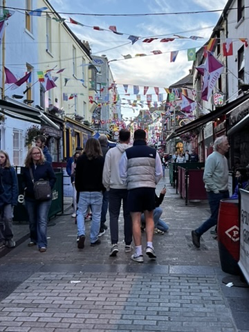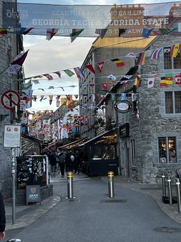 We ran into a sea of Americans at the pedestrian area, the historic section of downtown Galway. As you can see from the banner, there was a Georgia Tech vs. Florida State exhibition game, which is why there were so few vacancies at places to stay. At our hotel, I questioned several folks wearing football sweatshirts. I learned that Ireland sponsors these types of games regularly to “promote the sport of American football” (having lived in the soccer world for thirty years, I don’t think so) and to increase their tourism numbers (a more likely reason.)