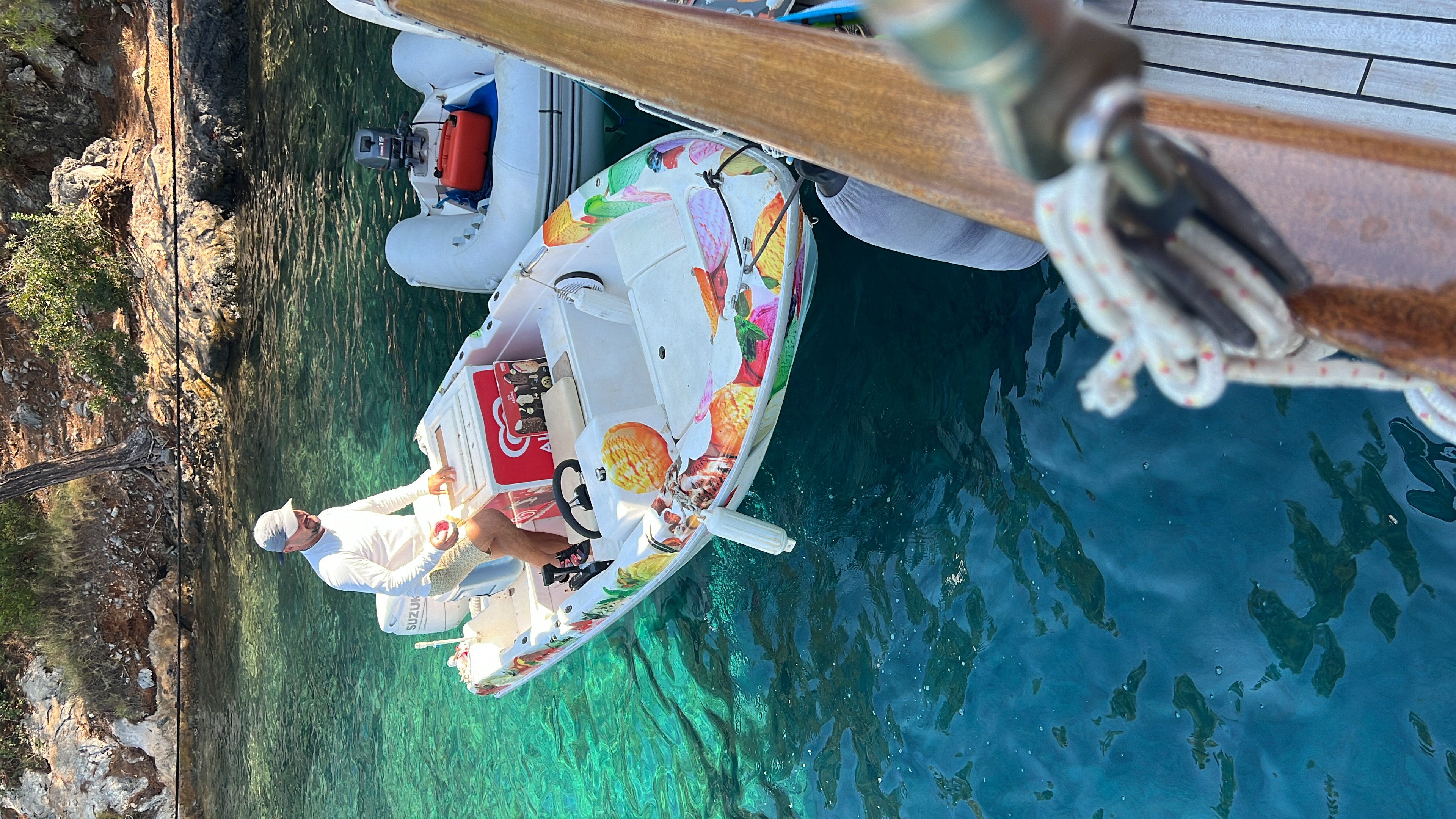 Göcek is a small town that has morphed into a vacation village for the wealthy. Restaurants line the bay across from the large marina, and when shopping, the stores are those I usually see in the upscale neighborhoods of Istanbul. Every possible need a boater might have can be delivered on water. Pizza, coffee, groceries, chocolate gifts—anything you might want—just ask them to deliver it directly to your boat. One of the grocery stores has a large boat as well, where you can shop for your groceries, right on the water. Unless you wish dinner in a restaurant, your feet never need to touch land.