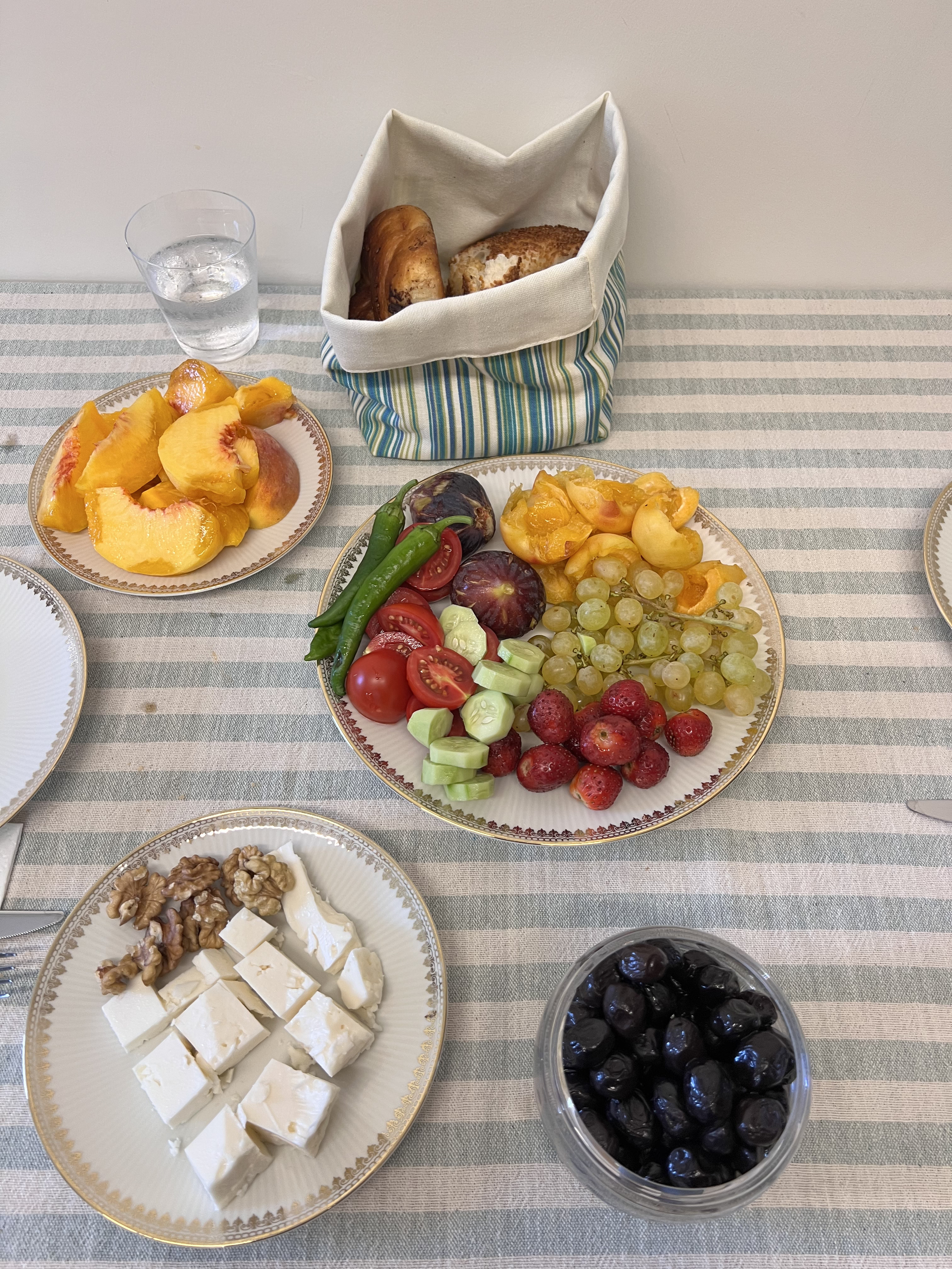 But why Turkey? For the food, silly. Here is our typical breakfast, and except for the seasonal fruit, it looks like this year-round. Sometimes, we’ll add eggs and more bread (we live next to a bakery), but always tomatoes, cucumbers, cheese, and olives.