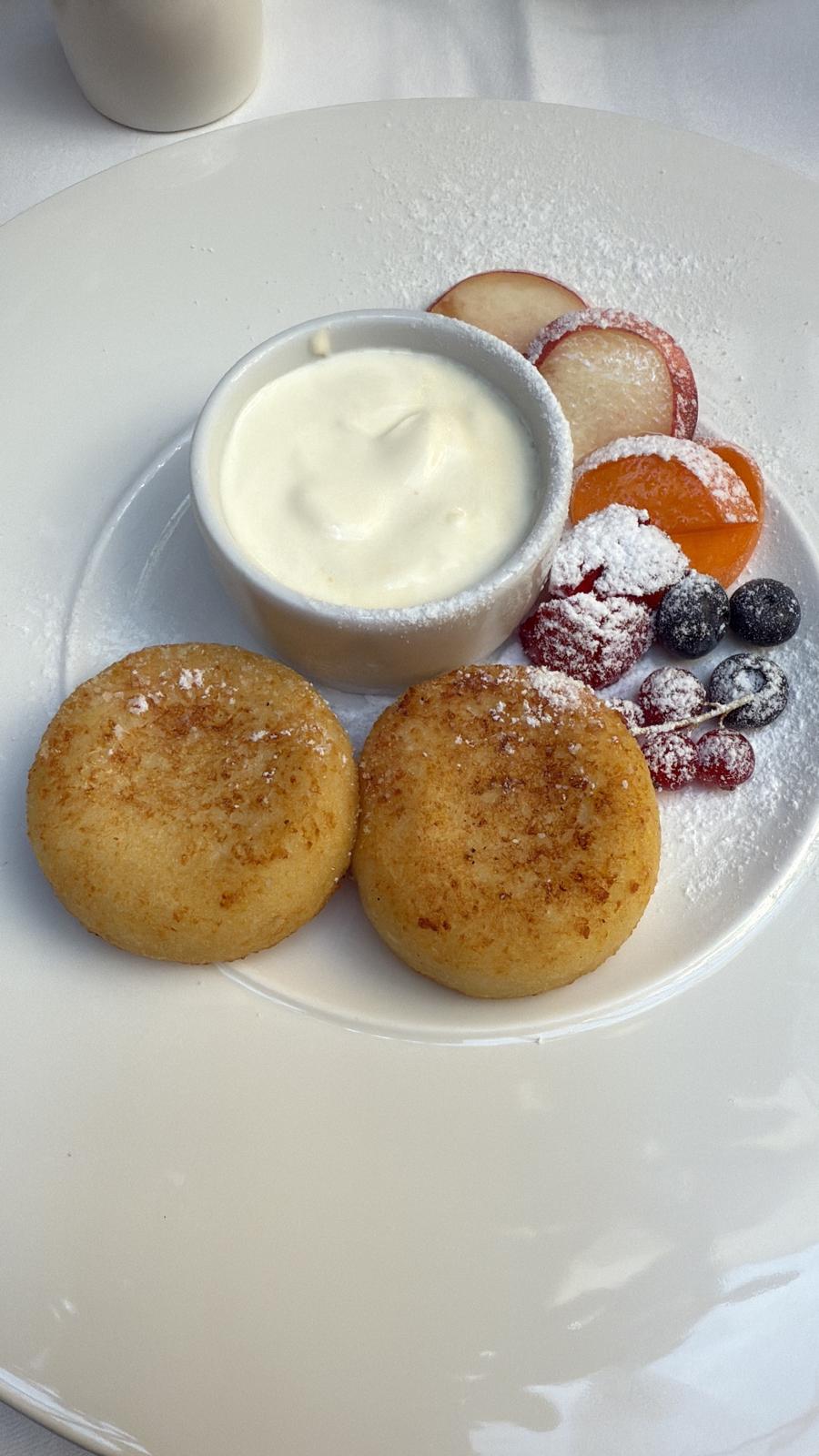 I ordered pancakes at the hotel and received these. They were filled with cottage cheese and were almost like blintzes. Dipped in sour cream, they were outstanding.