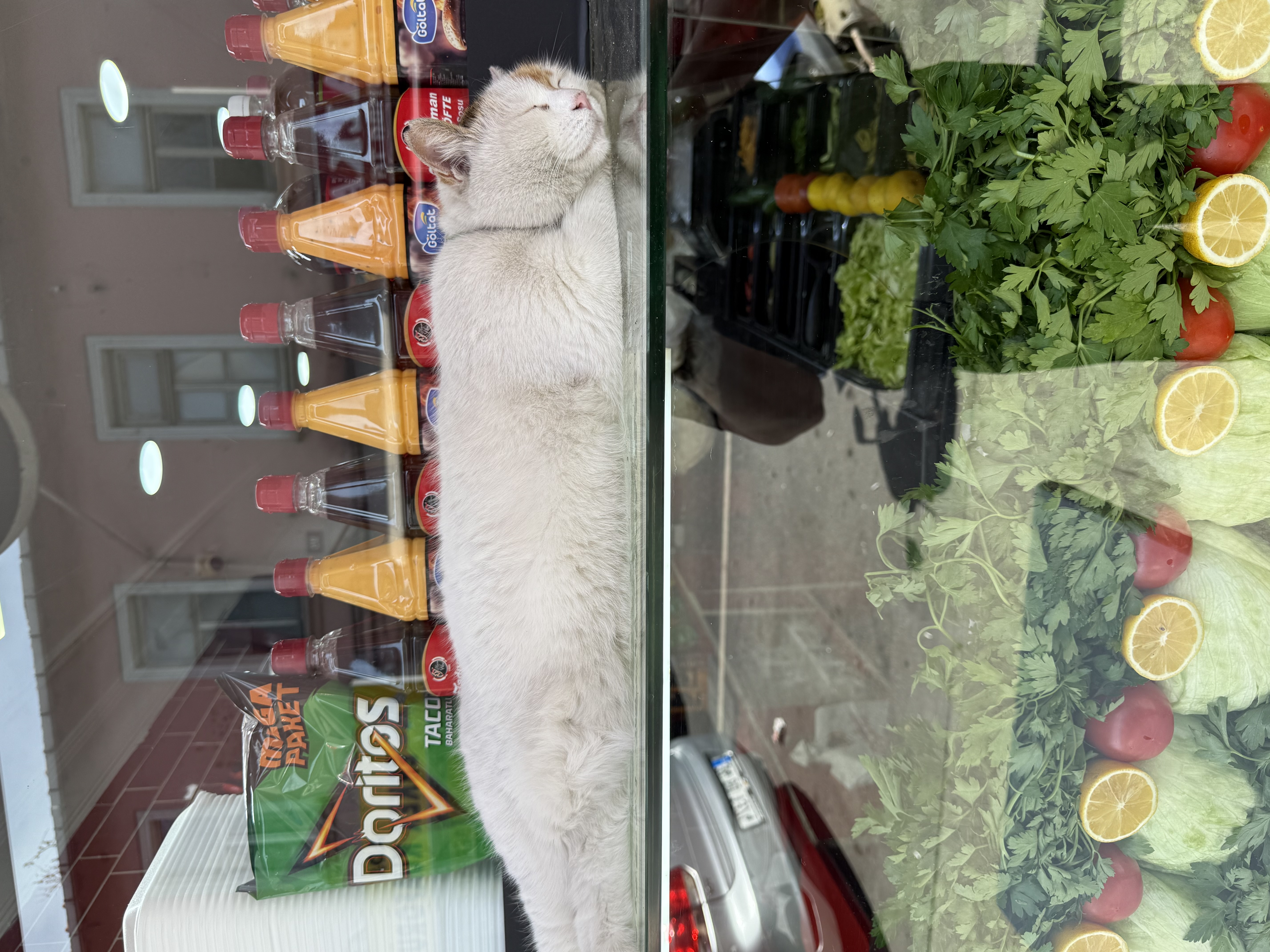 As usual, the cats are everywhere. They are so well cared for that they lounge on every possible flat surface, both inside and outside the stores. I’m sure if there were no glass around the lettuce, tomatoes, and parsley, the cat would be nestled right on top.