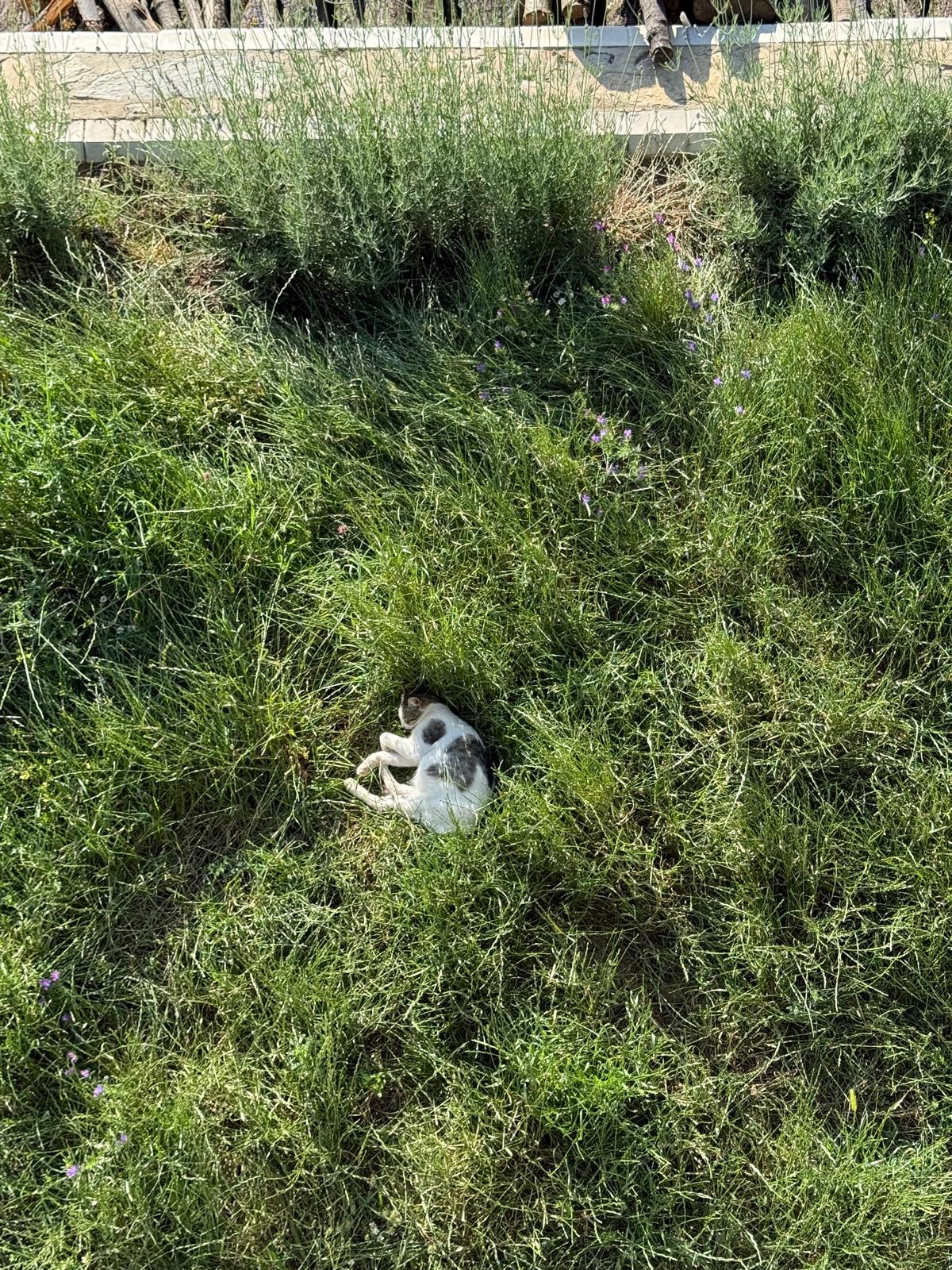 As you can see below, Norma is pregnant and sleeps most of the time away from everyone else in the soft grass. I am hoping this is where she will have her kittens. It is high and safe away from everyone else, and inside the fence, away from the forest animals that took her last kittens because she had them outside.