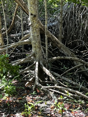 What looked like a boat canal was dredged alongside the property, and the edges had gigantic mangroves (luxury accommodations for the crocodiles) hugging the shore. While familiar with mangroves, having lived in Key West, I have never seen roots this big.